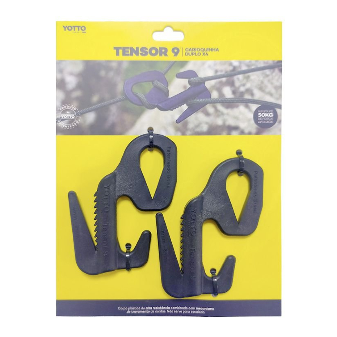 Um tensor de cabos inovador e fácil de utilizar que simula o nó carioca ou nó de caminhoneiro. O Tensor 9 Yotto é um produto leve e resistente. Pode ser utilizado desde acampamentos até amarrar produtos leves.